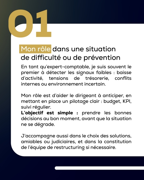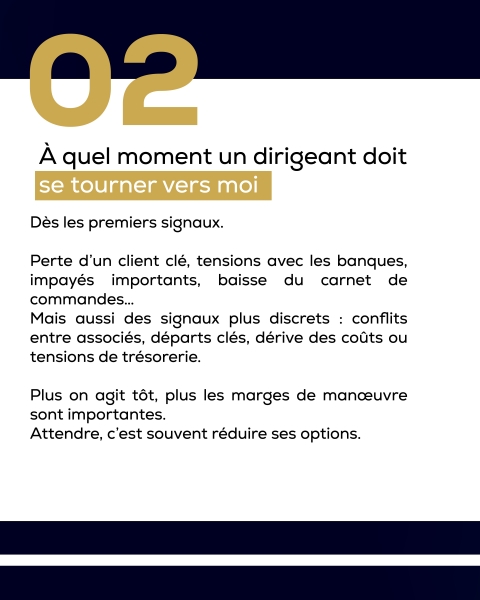 Il joue également un rôle d’orientation. En fonction de la situation, il peut accompagner le dirigeant vers les bons interlocuteurs et contribuer à structurer un dispositif adapté, qu’il soit amiable ou plus formalisé.